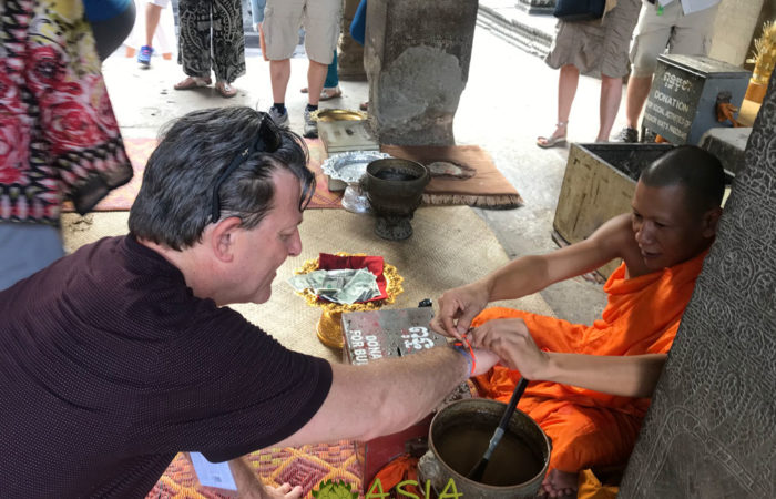 After lunch, we drive back to town and continue to cycle to Wat Athvea Pagoda outside Siem Reap and receive a water blessing. Walk with your guide through the stunning temple grounds and look at the architectural features of the complex, replete with garden paths and gilded spires. Once inside the pagoda, take a seat on the floor in front of a row of Buddhist monks who sit in saffron robes. Listen as the monk chant prayers in Pali, the language of early Buddhist scriptures. Along with your alms offering, you’ll find lotus and jasmine flowers amid the incense and candles used during the traditional ceremony. Receive a personal blessing from one of the monks as he ties a red thread around your wrist that is meant to bring good luck and prosperity. Your guide is always on hand to interpret what is said, help you to understand the role of Buddhism in Cambodia or answer any questions you have.